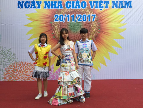 Sáng 20.11, gần 1.000 học sinh khối 9 trường THCS Trần Văn Ơn (Q.1) đã có màn trình diễn thời trang ấn tượng trong buổi lễ kỷ niệm Ngày Nhà giáo Việt Nam. Sử dụng những nguyên vật liệu tái chế như bao bố, vỏ lon, đĩa CD, giấy báo… mỗi lớp tự thiết kế 2 bộ trang phục với chủ đề khác nhau để thể hiện sự tri ân với thầy cô của mình.